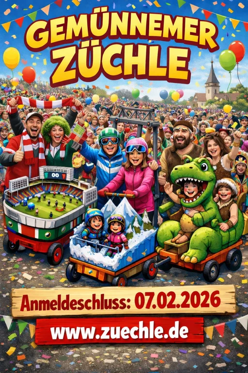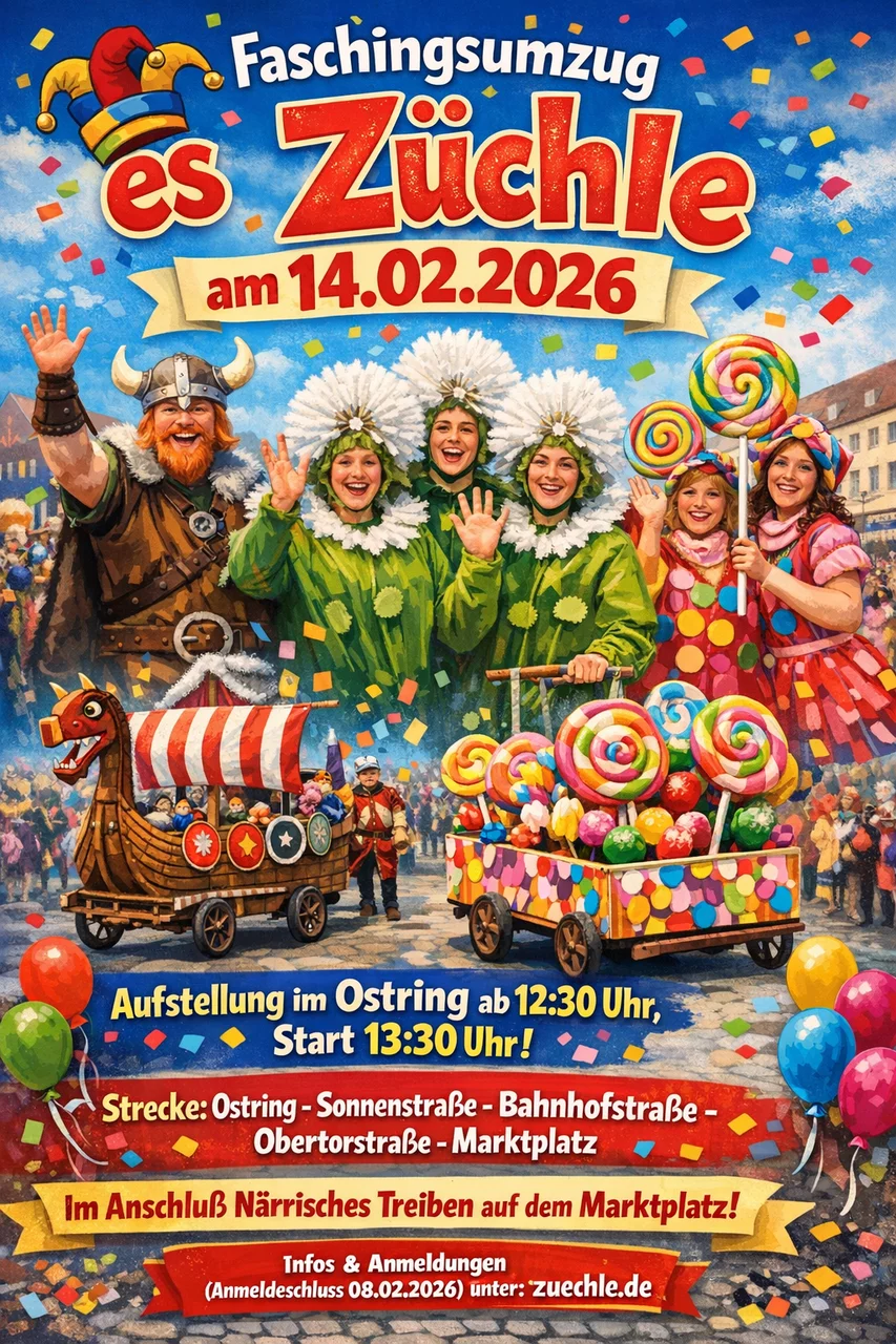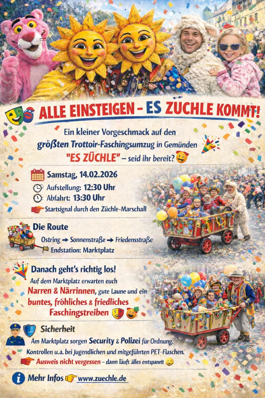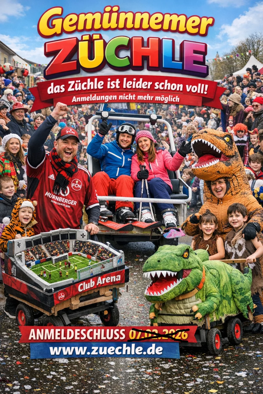 „Es Züchle“ bedankt sich schon jetzt bei allen Mitwirkenden, Unterstützern und Helfern, die jedes Jahr dafür sorgen, dass unser traditioneller Faschingszug nicht nur mit Volldampf fährt – sondern begeistert.